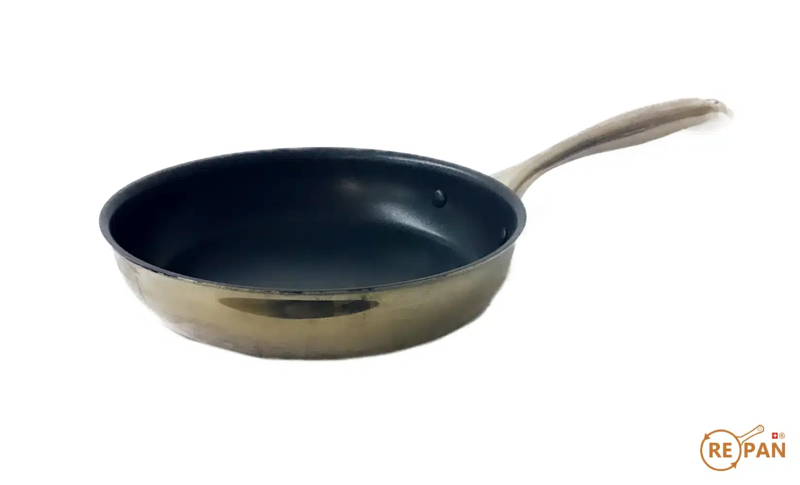 Betty Bossi Edelstahlpfannen mit ergonomischem Mettallstiel. Im Origninal waren diese ohne Beschichtung, doch durch RePan neu beschichtet mit DER keramikverstärkten Anti-Haftbeschichtung