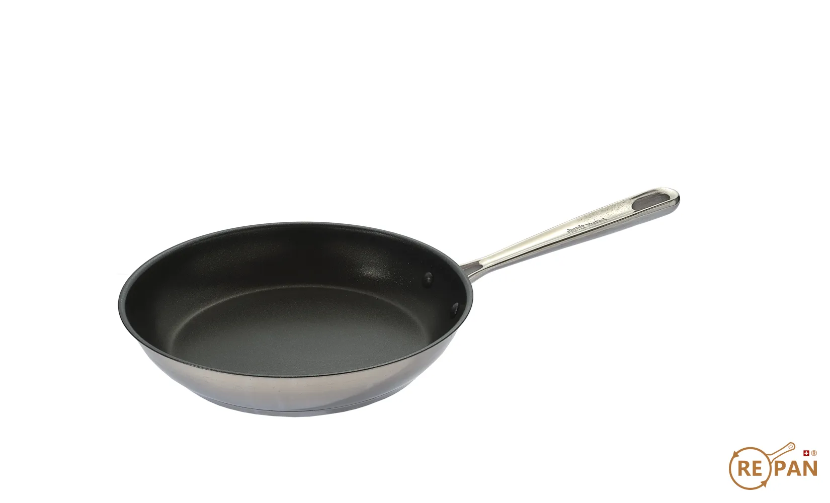 Stilvolle und langlebige Edelstahl-Pfanne mit genietetem Pfannenstiel und gleichmässiger Hitzeverteilung während des Bratvorgangs.