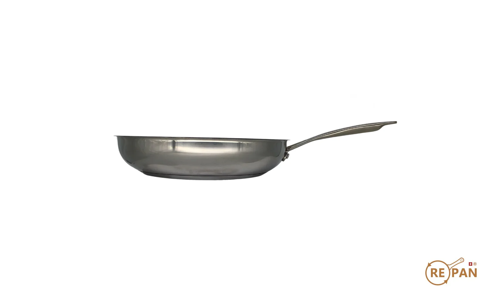 Schweizer Design steckt in der Kuhn Rikon „Luzern“ Pfanne aus Edelstahl mit Metallstiel, erkennbar am Schweizerkreuz im Stiel und dem relativ hohen Gewicht. RePan erhält das Schweizer Design, Material und Ressourcen und beschichtet mit langlebigster Beschichtung neu. Qualität aus der Region mit bis zu 95% weniger Ressourcenverbrauch.