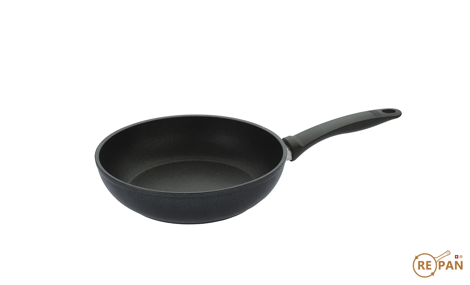 Die Kuhn Rikon Titanio Star ist eine Profipfanne aus Aluminium mit ikonischem Metallende am Stiel. Grund ist, dass die Bratpfannen die Wärme bis in den Rand verteilen. RePan erhält das Schweizer Design, Material und Ressourcen und beschichtet mit keramikverstärkter dreifach Beschichtung neu. Qualität aus der Region.