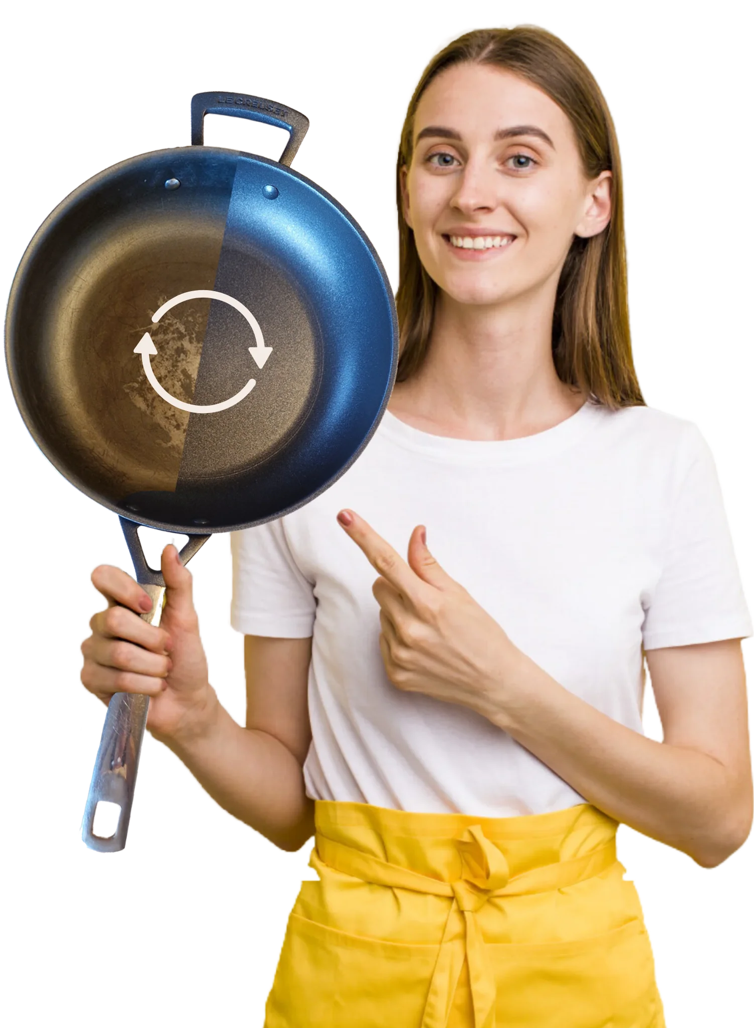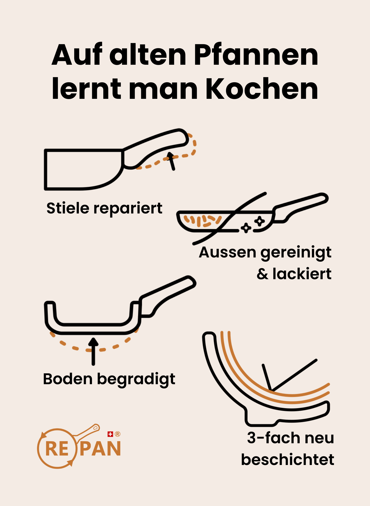 Alle Marken, Formen, Grössen & Materialien: Wir entfernen die alte Beschichtung und applizieren unsere keramikverstärkte dreifach Antihaftbeschichtung – frei von PFOA, APEO, GenX & BPA.
