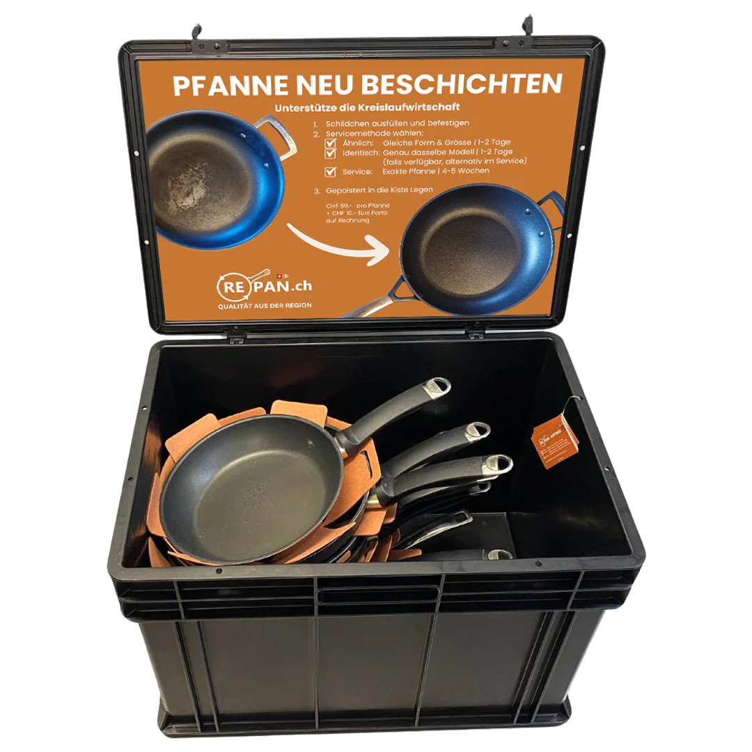 Noch besser ist beides! Wir versenden erst die Pfanne ab Lager in einer Mehrwegkiste - perfekt, um anschliessend deine Pfannen zur Neubeschichtung einzusenden. Füge hierzu eine Neubeschichtung UND eine Pfanne ab Lager hinzu.