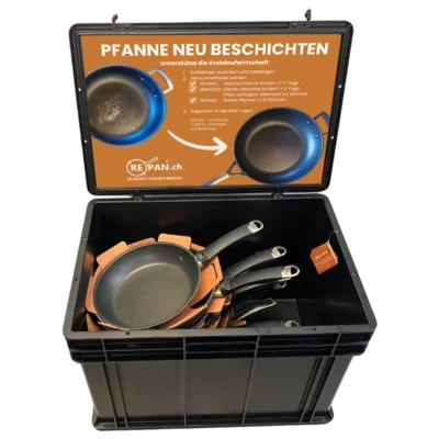 Unsere Pfannen sind neu beschichtet und sofort lieferbar. Kleine Spuren aus ihrem ersten Leben sind normal – die Funktion bleibt top.